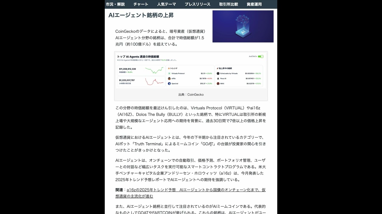 【2025年】仮想通貨のAIエージェント分野、時価総額が1.5兆円超え VIRTUALやAI16Zがけん引【主要カテゴリか】 投稿日時: 12月 16, 2024 投稿者: filmtn7753KASOU