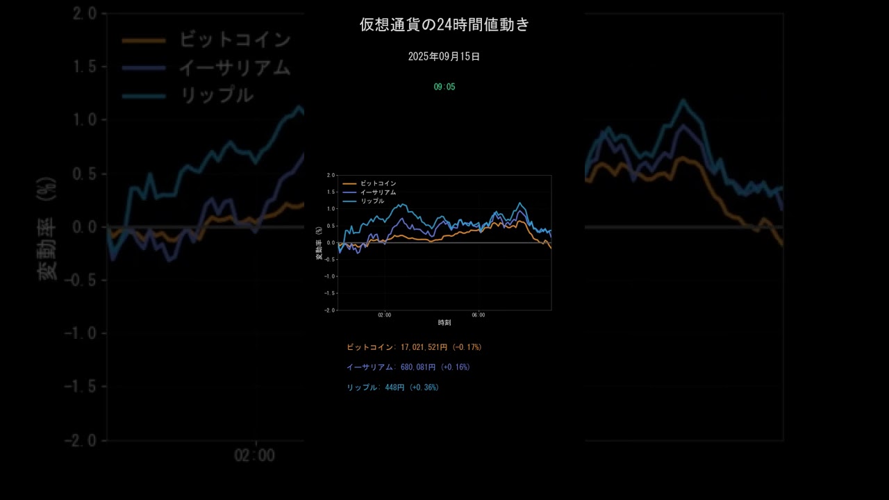 ⏱ タイムスタンプ 0:00 オープニング 0:15 中盤の値動き 0:30 24時間統計情報 📈 2025年09月15日(月) の統計 ━━━━━━━━━━━━━━━━━━━━━ 【ビットコイン】 現在価格: ¥16,936,435 24時間変動: -0.66% 最高値: ¥17,238,474 (+1.11%) 最安値: ¥16,890,970 (-0.93%) ━━━━━━━━━━━━━━━━━━━━━ 【イーサリアム】 現在価格: ¥666,267 24時間変動: -1.87% 最高値: ¥689,389 (+1.53%) 最安値: ¥663,618 (-2.26%) ━━━━━━━━━━━━━━━━━━━━━ 【リップル】 現在価格: ¥444 24時間変動: -0.62% 最高値: ¥453 (+1.38%) 最安値: ¥437 (-2.19%) 🔔 チャンネル登録で毎日0時に最新相場配信! 💬 コメントで感想をお聞かせください #ビットコイン #仮想通貨 #9月15日 返信 ↓