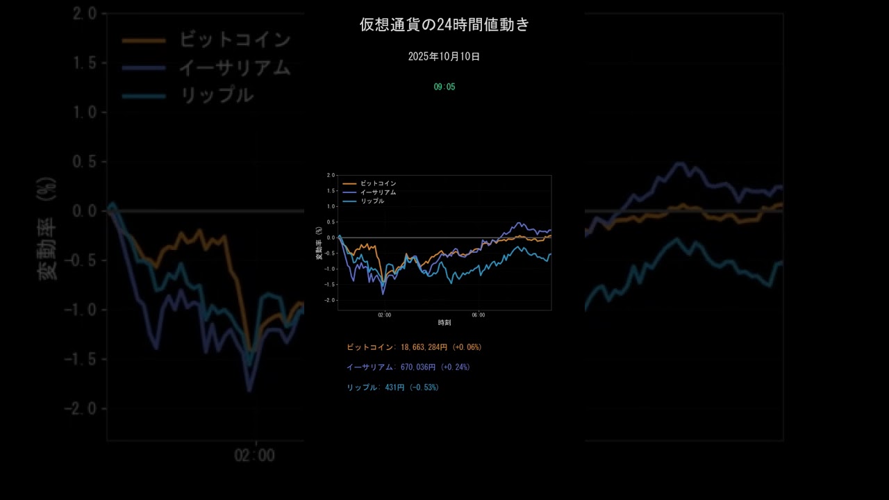 ⏱ タイムスタンプ 0:00 オープニング 0:15 中盤の値動き 0:30 24時間統計情報 📈 2025年10月10日(金) の統計 ━━━━━━━━━━━━━━━━━━━━━ 【ビットコイン】 現在価格: ¥18,419,526 24時間変動: -1.25% 最高値: ¥18,720,935 (+0.37%) 最安値: ¥18,387,874 (-1.42%) ━━━━━━━━━━━━━━━━━━━━━ 【イーサリアム】 現在価格: ¥654,290 24時間変動: -2.12% 最高値: ¥673,302 (+0.72%) 最安値: ¥654,290 (-2.12%) ━━━━━━━━━━━━━━━━━━━━━ 【リップル】 現在価格: ¥428 24時間変動: -1.16% 最高値: ¥434 (+0.14%) 最安値: ¥426 (-1.56%) 🔔 チャンネル登録で毎日0時に最新相場配信! 💬 コメントで感想をお聞かせください #ビットコイン #仮想通貨 #10月10日 返信 ↓